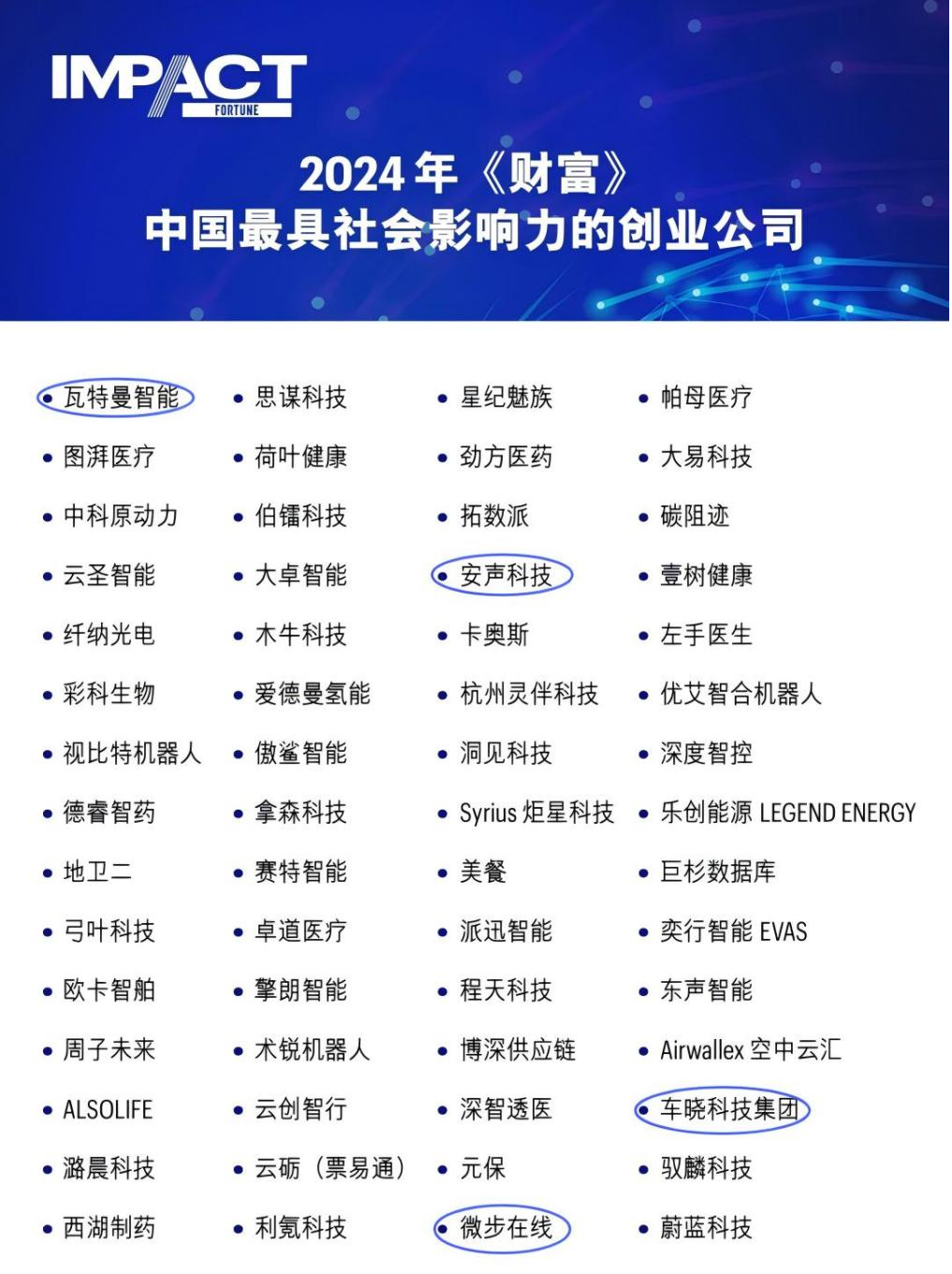近日,全球著名商業(yè)雜志《財(cái)富》(Fortune Magazine)發(fā)布“2024年中國最具社會影響力的創(chuàng)業(yè)公司”榜單。創(chuàng)投集團(tuán)4家被投企業(yè)成功上榜,包括:瓦特曼智能、安聲科技、微步在線和車曉科技。